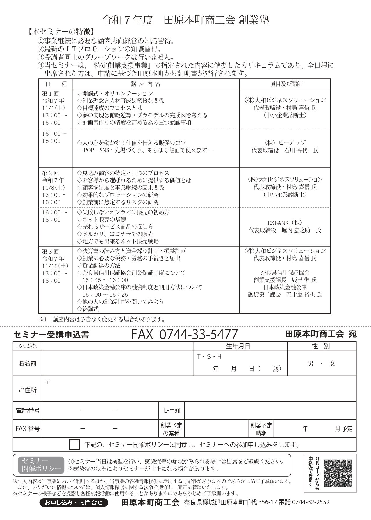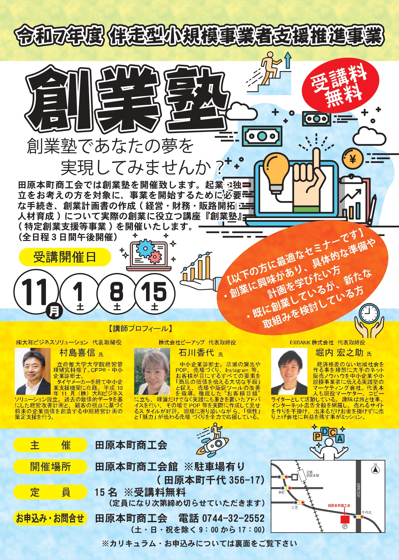 田原本町商工会では、創業・起業をお考えの方を対象に、事業を開始するための手続き、ビジネスプランの作成(経営・財務・販路開拓・人材育成)、所得税や消費税の知識についてなど、実際の創業に役立つ講座となる「創業塾」を開催されます。