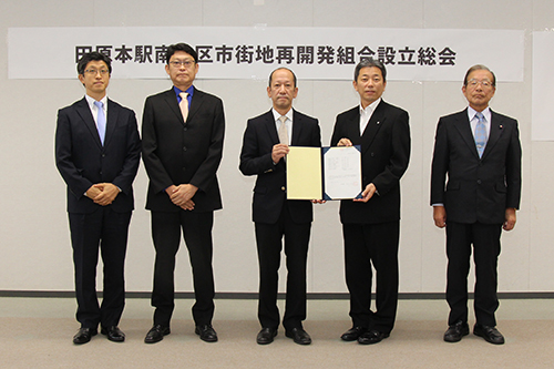 「田原本駅南地区市街地再開発組合より町長に組合設立の報告」