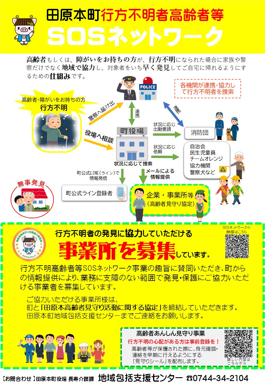 田原本町行方不明高齢者等SOSネットワークは、高齢者もしくは障がいをお持ちの方が、行方不明になられた場合に家族や警察だけでなく地域で協力し、対象者をいち早く発見してご自宅に帰れるようにするための仕組みです。