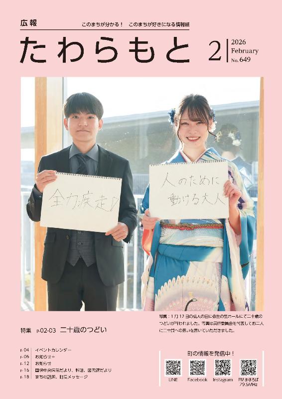 広報たわらもと 最新号 広報たわらもと令和8年(2026年)2月号 バックナンバー 広報たわらもと令和8年(2026年)1月号 令和7年 令和6年 令和5年 令和4年 令和3年 令和2年 平成31年 平成30年 平成29年 平成28年 平成27年 平成26年 平成25年 平成24年 広報たわらもとに広告を掲載しませんか 「広報たわらもと」の配置場所 我が家の天使募集中 「かがやき」の応募方法 配送日程 スマホアプリ「マチイロ」