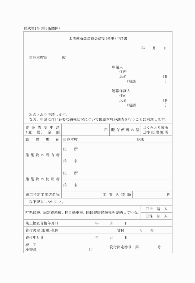 3 水洗便所に改造しようとする建築物が資金の貸付を受けようとする者の所有でないものにかかるときは、改造工事を行うことについて所有者の水洗便所改造同意書(様式第2号)を提出しなければならない。