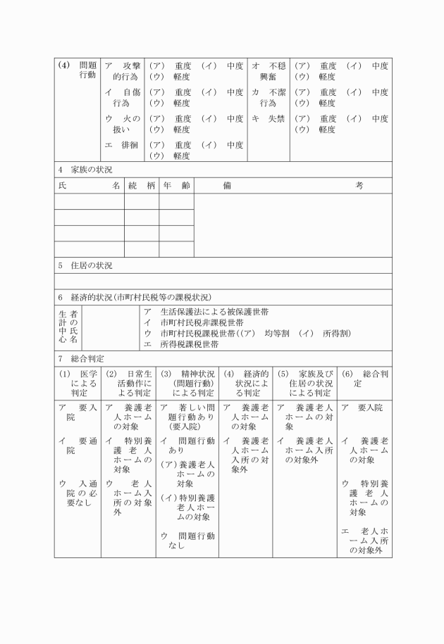 ウ 精神の状況 | 審査票による認知症等精神障害の問題行動が軽度であって日常生活に支障があり、かつ、その老人の世話を行う養護者がないか、又はあっても適切に行うことができないと認められること。 |
