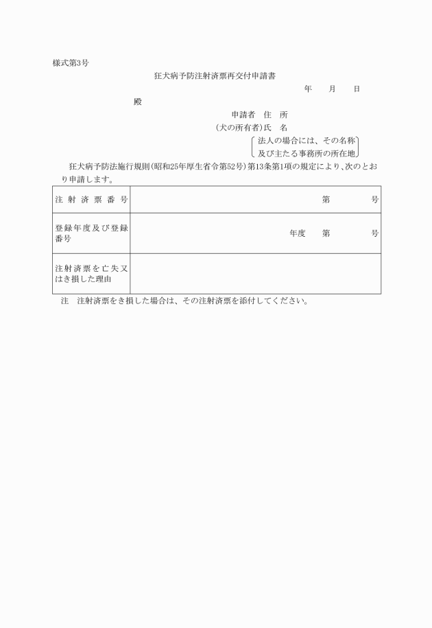 3 規則第5条に規定する狂犬病予防注射済票再交付申請書 様式第3号