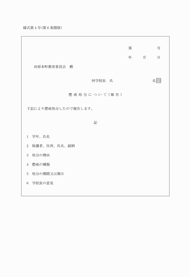 第6条 校長は、施行規則第26条の規定による懲戒のうち、退学又は停学の処分をしたときは、様式第4号により委員会に報告しなければならない。