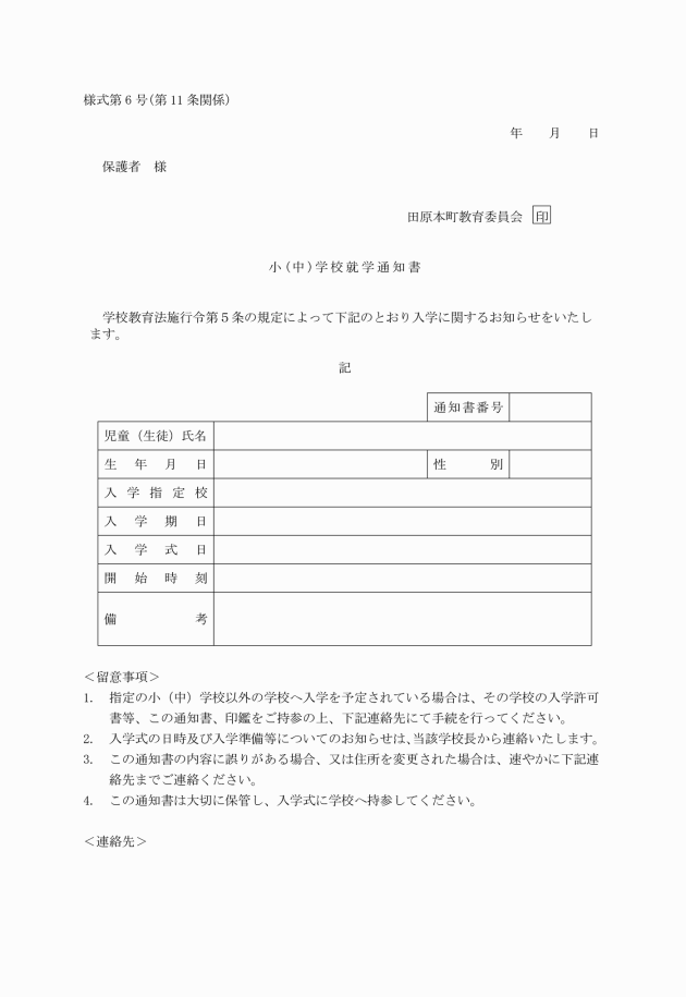 第11条 令第5条及び第6条の規定により、委員会が保護者に行う入学期日の通知及び学校の指定は、様式第6号によるものとする。