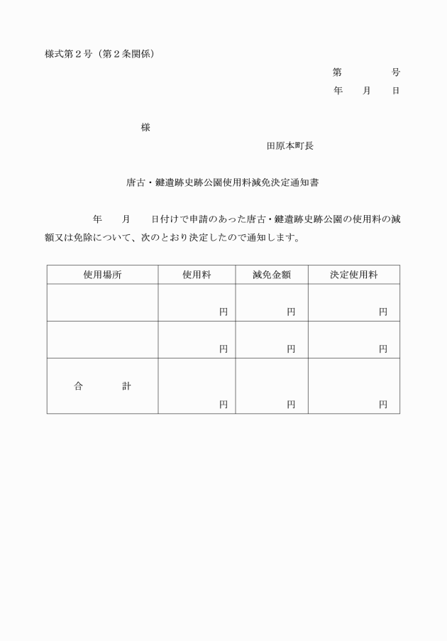 2 条例第13条の規定により使用料の減額又は免除を受けようとする者は、唐古・鍵遺跡史跡公園条例施行規則(平成30年2月田原本町教育委員会規則第5号)第2条第1項の規定による申請の際に、唐古・鍵遺跡史跡公園使用料減免申請書(様式第1号)を町長に提出しなければならない。