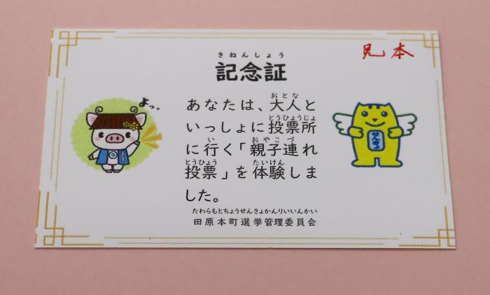 投票に同伴した18歳未満のお子さんに「親子連れ投票記念証」をお渡ししています。