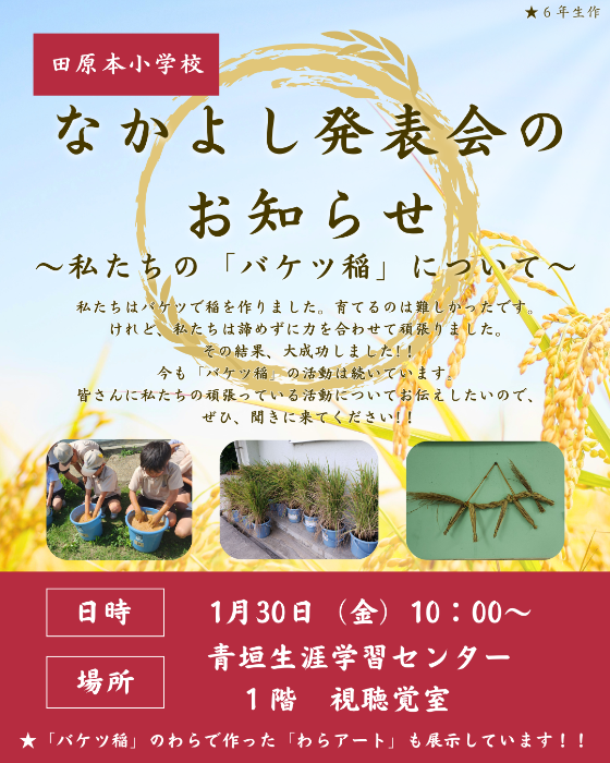 田原本小学校で取り組んできた「バケツ稲」について、地域の方々を招いて活動発表会を行いたいと思います。これまでの活動について子どもたちが一生懸命発表しますので、ぜひお越し下さい。