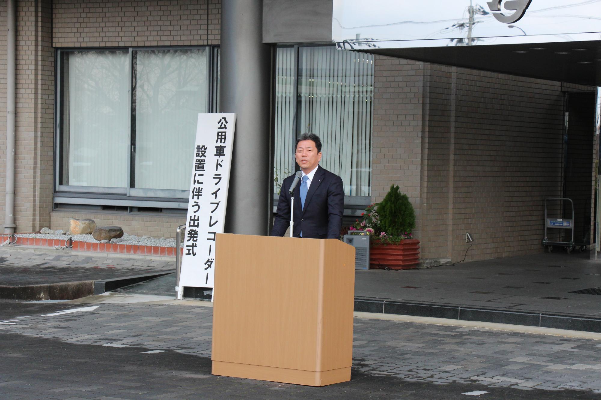 職員の安全運転意識及び運転マナーの向上、見守り活動等の目的で、ほぼ全ての公用車69台にドライブレコーダーを設置し、1月9日、田原本町役場正面玄関前において、奈良県警察天理警察署長、天理警察署田原本警察庁舎所長、田原本町議会議長のご出席のもと、公用車ドライブレコーダー設置に伴う出発式を行いました。