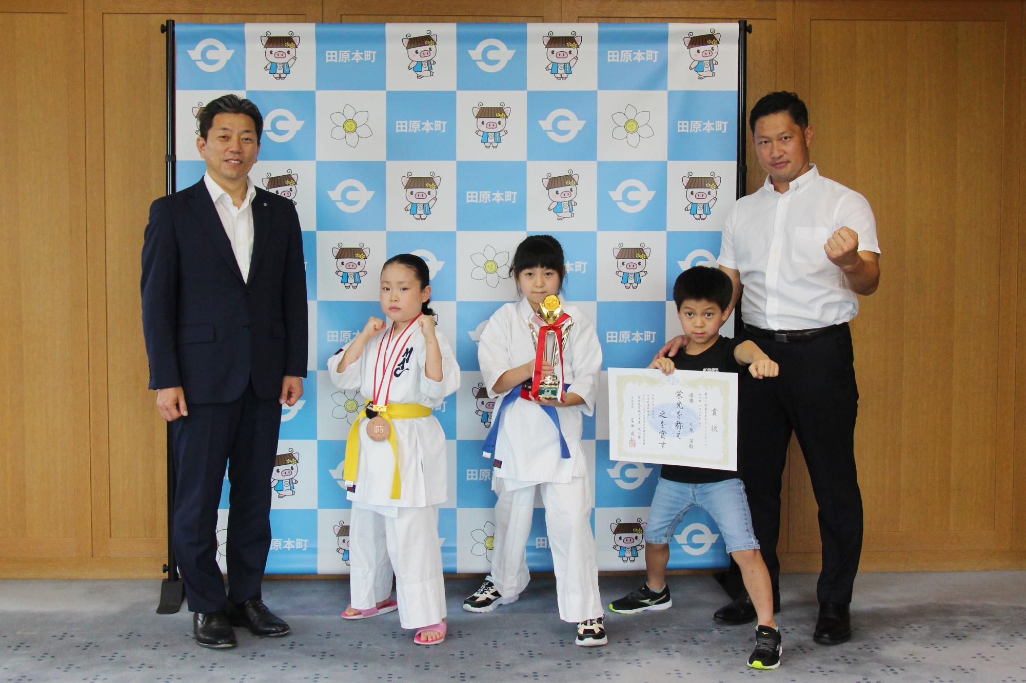 九鬼栞さん(南小4年生)と平井來々亜さん(南小3年生)が空手道全国大会への出場の報告のため、訪問されました。活躍を期待し、激励の言葉を述べさせていただきました。