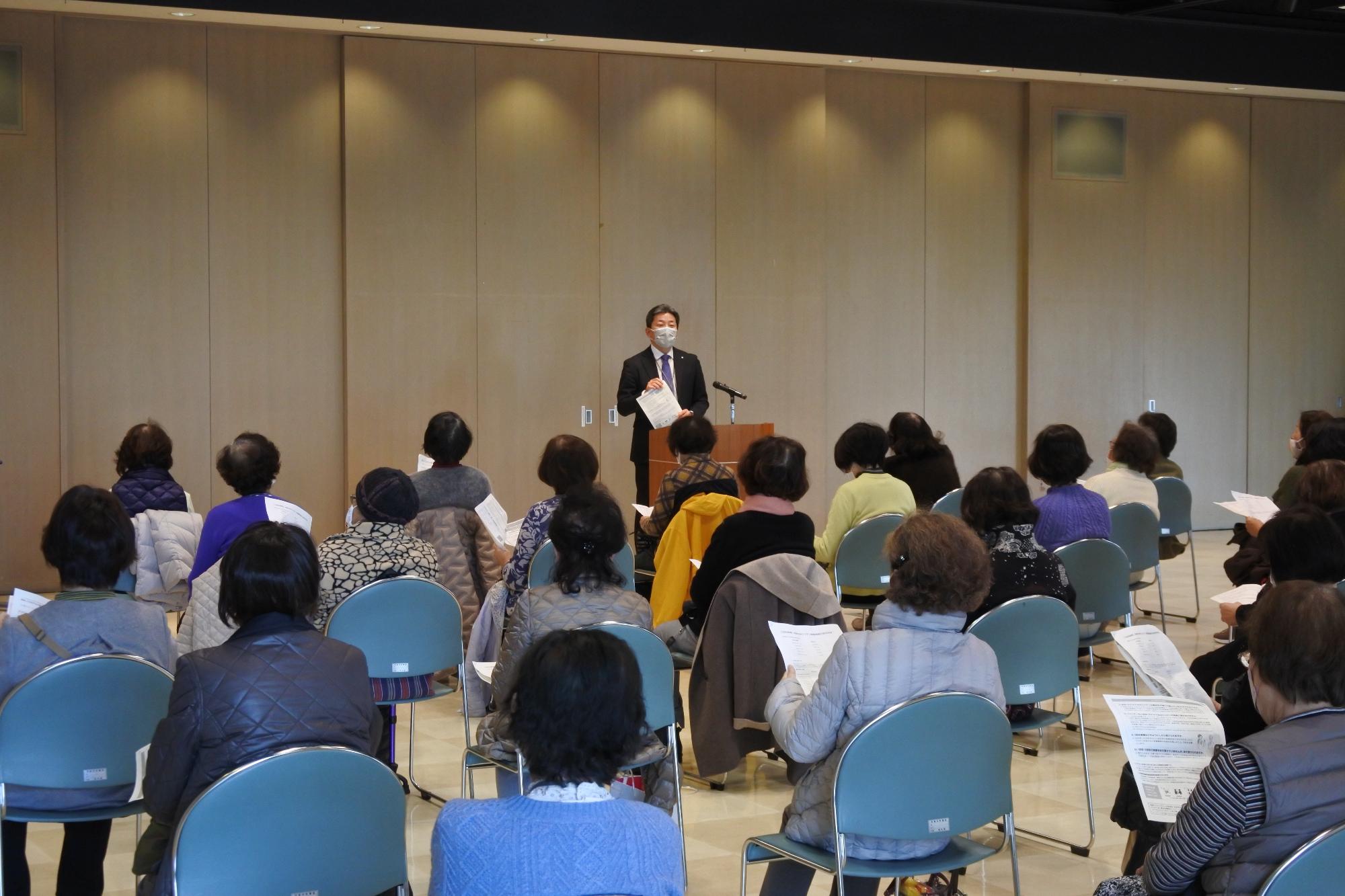 町民ホールにて、令和3年度 田原本町生活学校閉校式が開催され、来賓として出席しました。明るく住みよい地域づくりのためにご活躍いただいていることへのお礼を申し上げました。