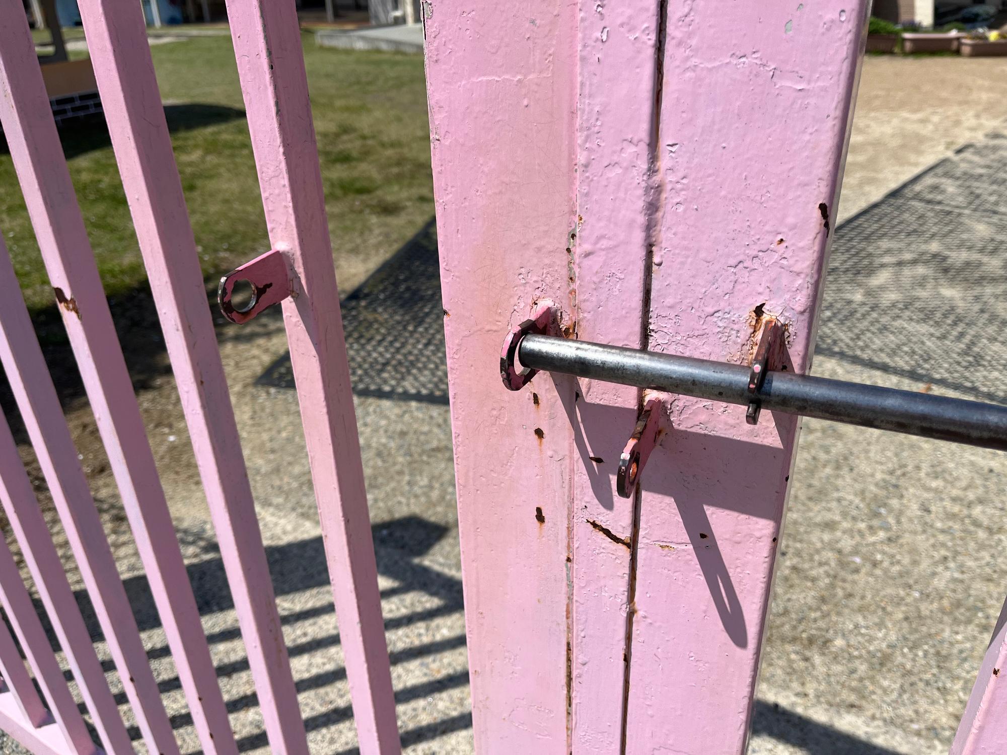 平野幼稚園において、門扉の歪みにより閂(かんぬき)が締めにくく、お迎えに来られた保護者が怪我をされたことから修繕しました。【施工:町職員】