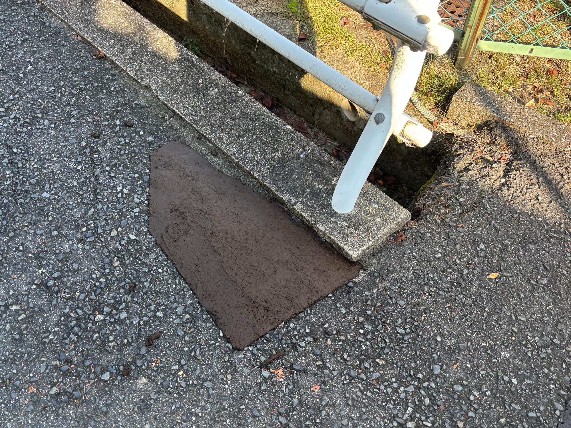 田原本中学校において、昇降口前の路面が陥没しており、生徒が躓き怪我をする恐れがあることから修繕しました。【施工:町職員】