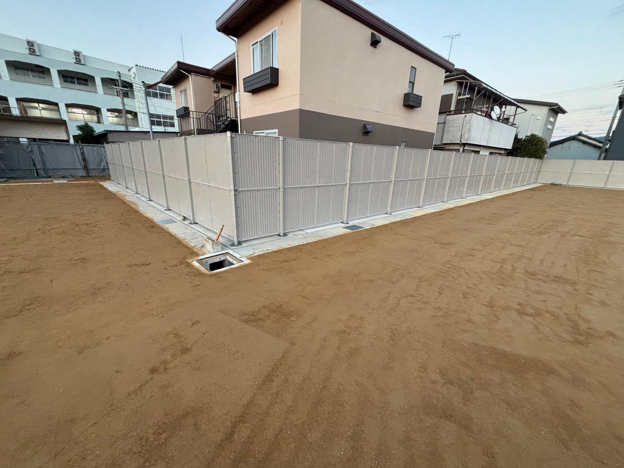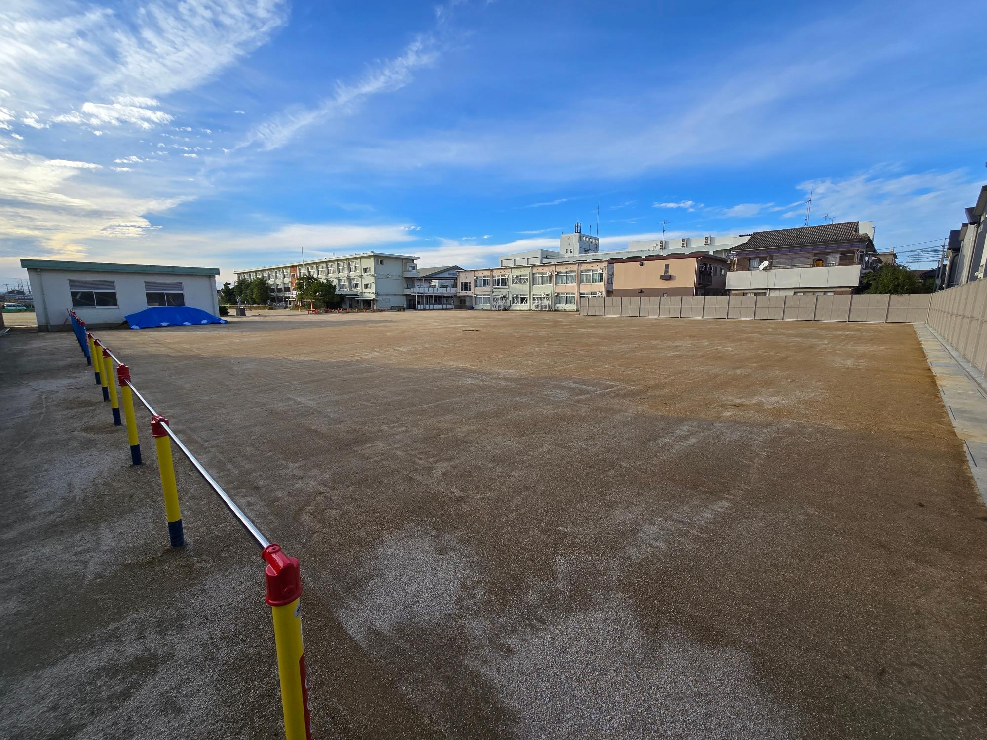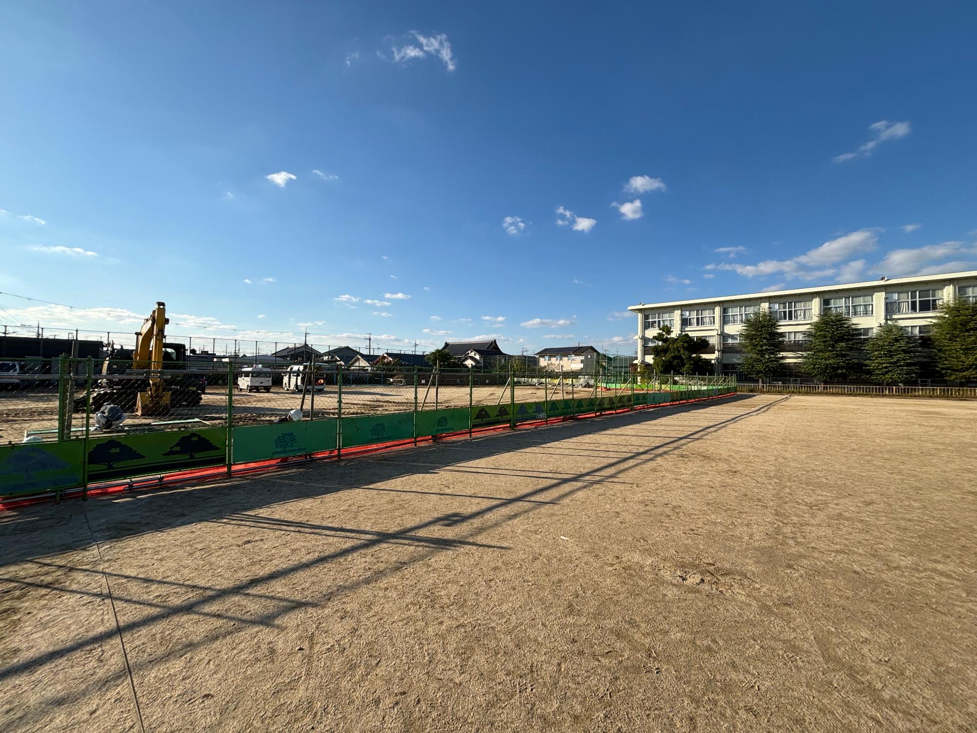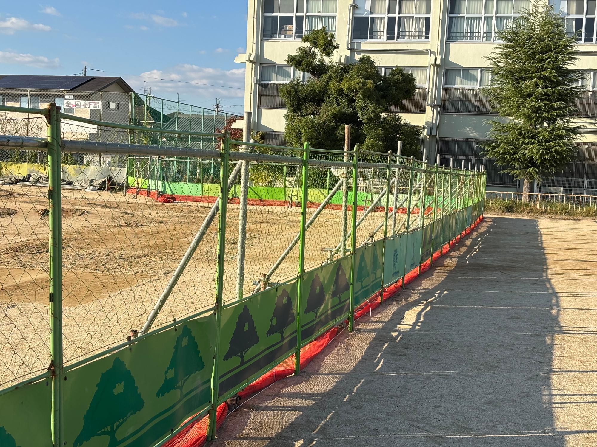 現在の屋外運動場部分の文化財発掘工事が始まりました。発掘区域を工事用フェンスで囲んでいます。まずは、先行して西側部分の発掘を実施します。