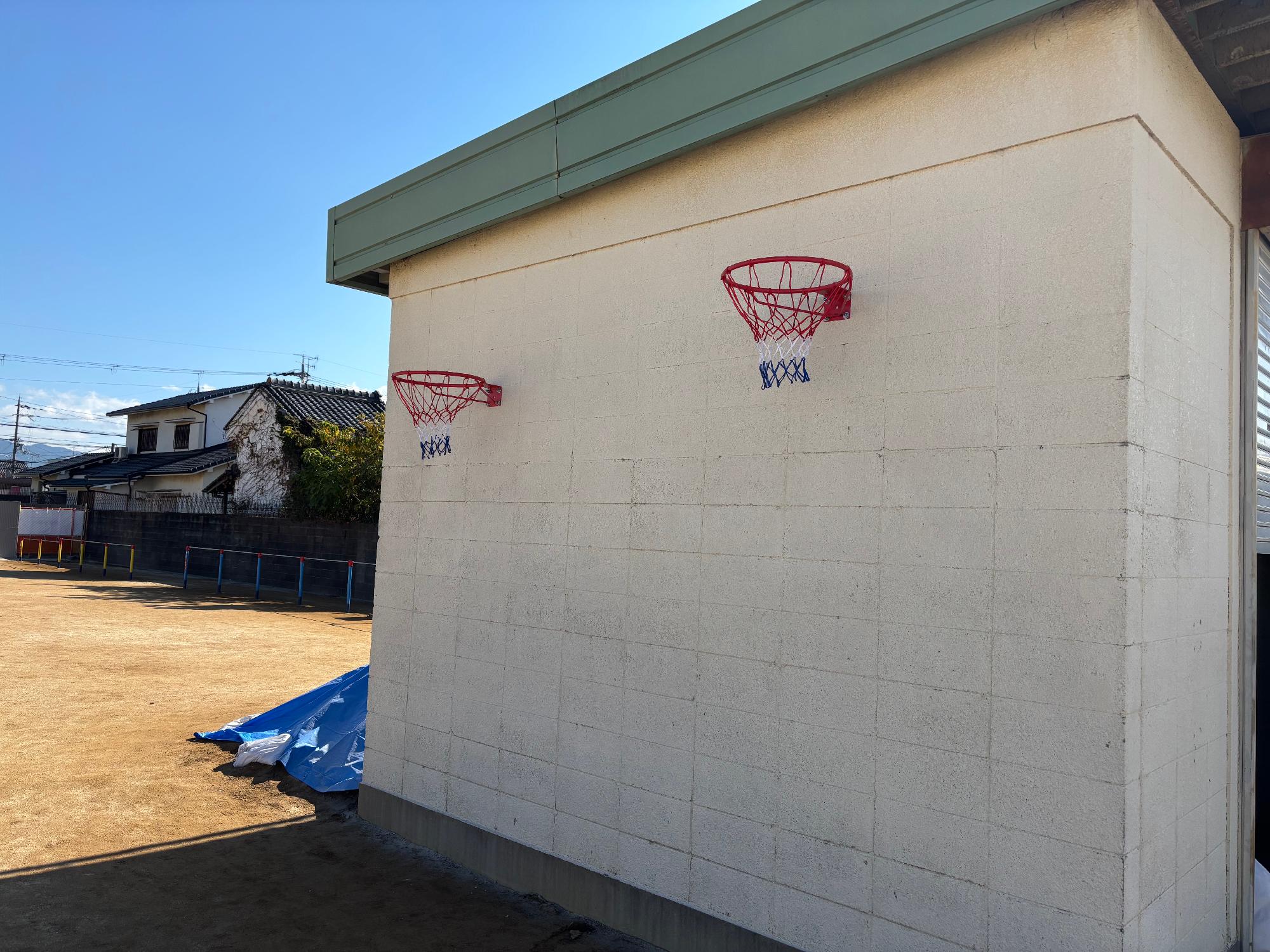 令和7.11.20 仮設屋外運動場にバスケットゴールを設置しました。