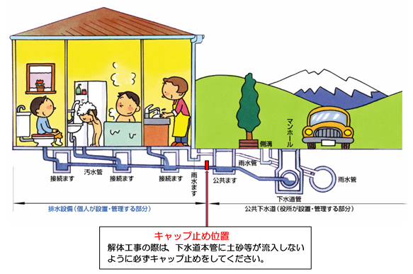 公共汚水桝は、田原本町の所有物であり、解体工事の際に、破損や無断で撤去した場合は、復旧費用を負担していただくこととなりますので、十分ご注意ください。また、宅内の排水管を撤去する場合は、下水道管へ土砂などが流入しないように「キャップ止め」を行い、「公共汚水桝」の表面が地上に露出する形で残していただきますようお願いします。