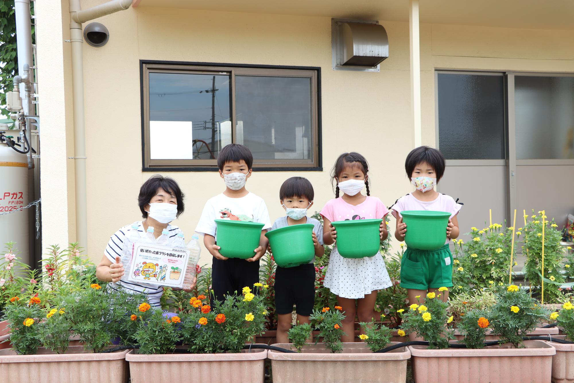 本プログラム(テラサイクル社)では、10グラム(約1本)を2ポイントとし、植木鉢等と交換することができます。今回、全ポイントの内の7,000ポイントを使用し、植木鉢5個と引き換えました。令和4年8月、ご協力いただいている町内幼稚園へ配布しました。今後、小中学校にも順次配布していく予定です。
